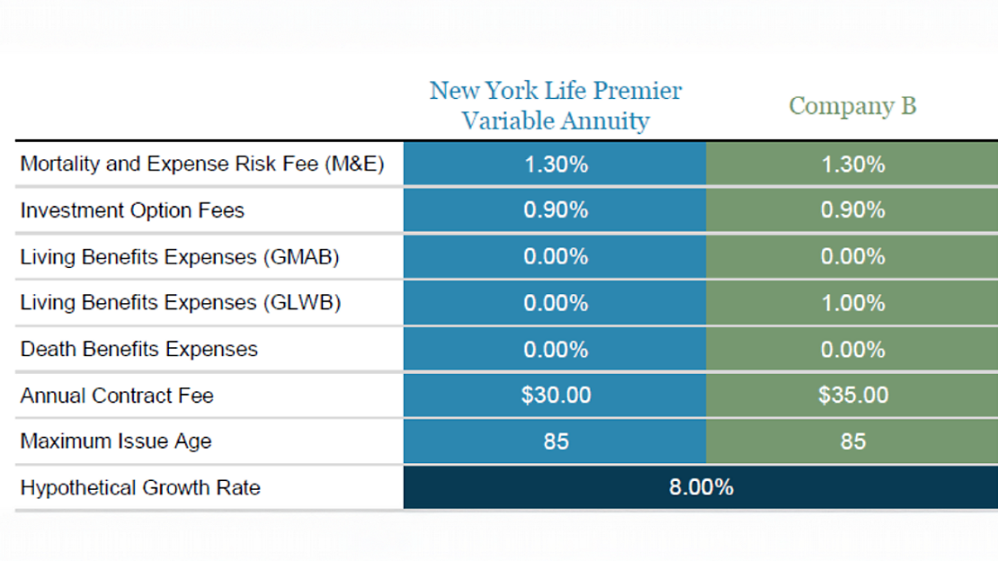 The New York Life Premier Variable Annuity–FP Series helps investors pursue long term, tax advantaged growth, with features to help maximize value, including a premium-based level M&E fee structure option that charges based on the amount invested, not on the accumulation value of the policy.