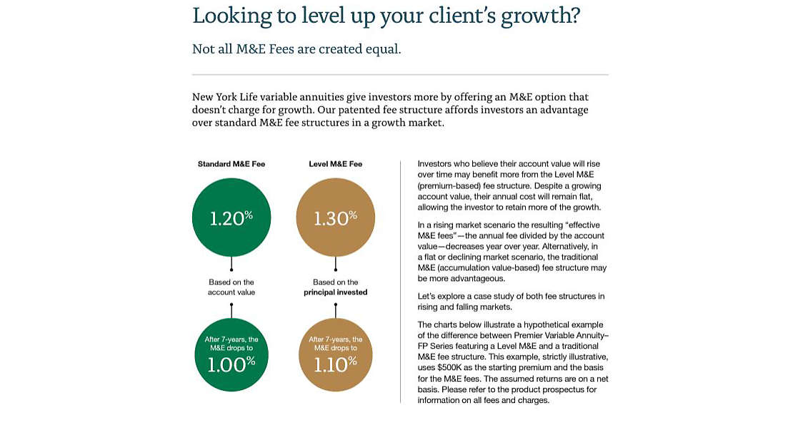 - Promotes the Level M&E fee as a cost-effective option for investors confident in long-term market growth, enabling them to maximize returns without extra fees.